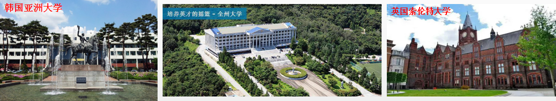 学校韩国亚洲大学、新罗大学、全州大学、美国匹马社区学院、新加坡TMC、英国索伦特大学、英国巴斯斯巴大学等高校进行合作,可选择相关升本项目赴境外外攻读本科、硕士。主要采用“2+1+2”模式,在校两年,第三年通过语言考试,第四、五年在境外本科院校攻读专业课程。