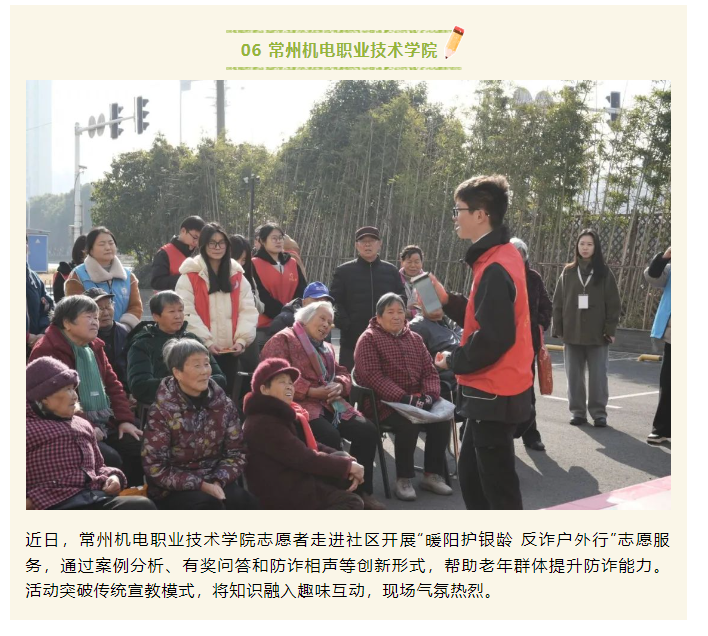 近日,常州机电职业技术学院志愿者走进社区开展“暖阳护银龄 反诈户外行”志愿服务,通过案例分析、有奖问答和防诈相声等创新形式,帮助老年群体提升防诈能力。活动突破传统宣教模式,将知识融入趣味互动,现场气氛热烈。