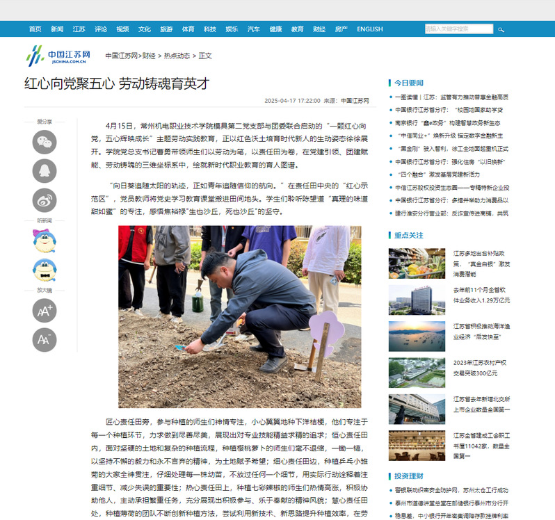 4月15日,常州机电职业技术学院模具第二党支部与团委联合启动的“一颗红心向党,五心辉映成长”主题劳动实践教育,正以红色沃土培育时代新人的生动姿态徐徐展开。学院党总支书记曹勇带领师生们以劳动为笔,以责任田为卷,在党建引领、团建赋能、劳动铸魂的三维坐标系中,绘就新时代职业教育的育人图谱。
