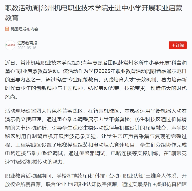 近日,常州机电职业技术学院组织青年志愿者团队赴常州多所中小学开展“科普润童心”职业启蒙教育活动。该活动作为学校2025年职业教育活动周职普融通示范日的重要内容之一,通过构建“专业赋能教育、实践培育人才”长效机制,着力培养新时代青少年的创新精神与工匠精神,弘扬劳动光荣、技能宝贵、创造伟大的时代风尚。