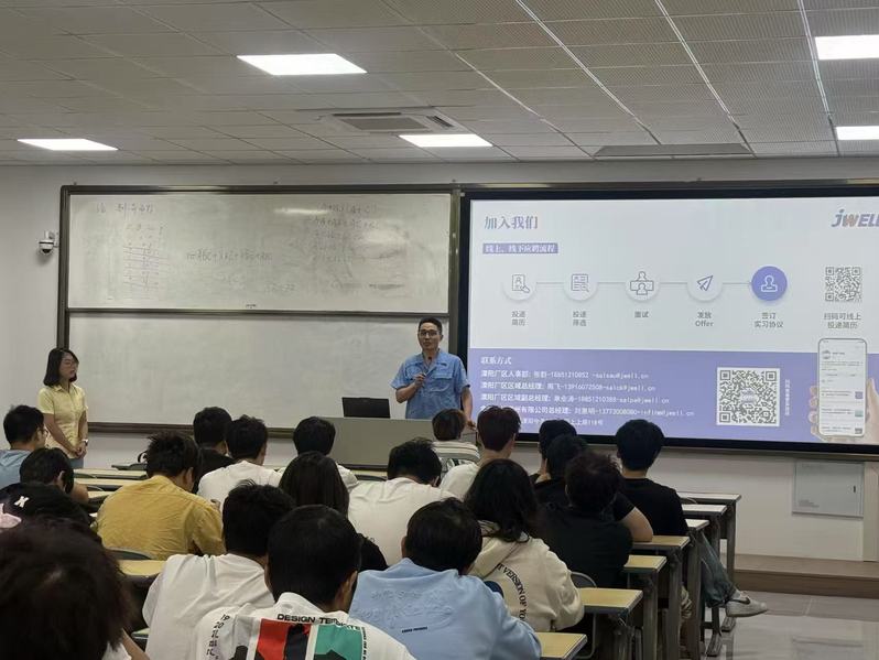 5月27日,机械工程学院在溧阳基地举行实习招聘宣讲会。金纬机械常州有限公司人力资源部部长张群,生产管理负责人、我校96届校友倪新明来校宣讲,机械工程学院辅导员牛晨子,部分22级学生参加活动。