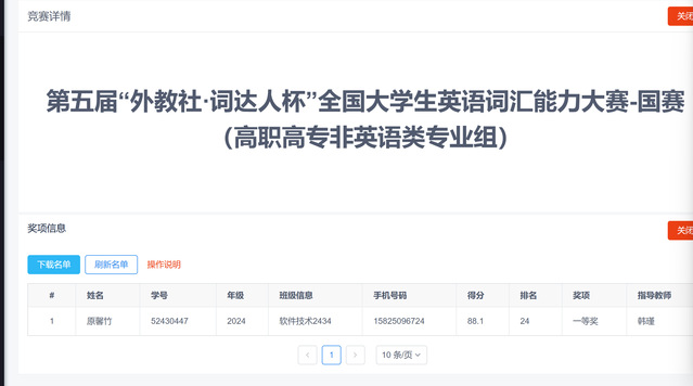 6月9日,2025年“外教社·词达人杯”全国大学生英语词汇能力大赛全国决赛成绩公布。我校信息工程学院学生原馨竹(指导教师:韩瑾)以高职高专非英语专业组第26名的好成绩斩获全国一等奖。