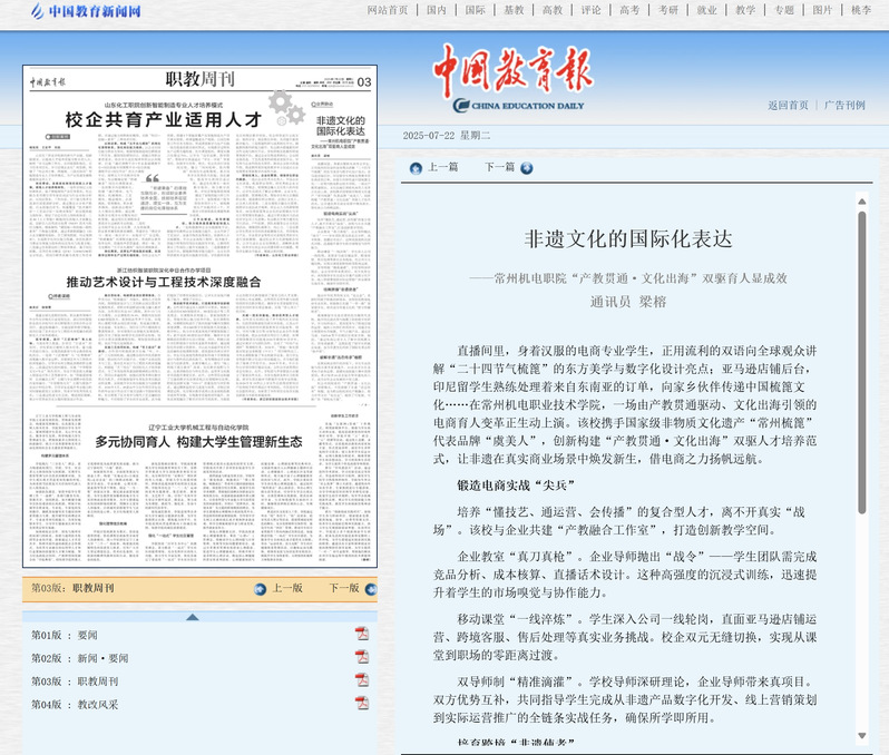 直播间里,身着汉服的电商专业学生,正用流利的双语向全球观众讲解“二十四节气梳篦”的东方美学与数字化设计亮点;亚马逊店铺后台,印尼留学生熟练处理着来自东南亚的订单,向家乡伙伴传递中国梳篦文化……在常州机电职业技术学院,一场由产教贯通驱动、文化出海引领的电商育人变革正生动上演。该校携手国家级非物质文化遗产“常州梳篦”代表品牌“虞美人”,创新构建“产教贯通·文化出海”双驱人才培养范式,让非遗在真实商业场景中焕发新生,借电商之力扬帆远航。