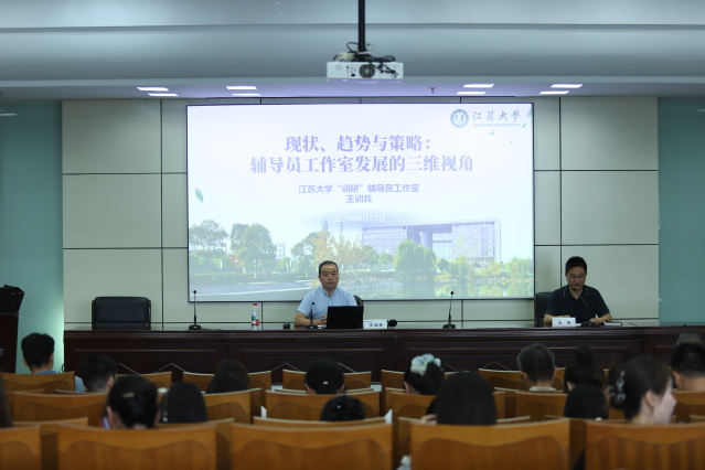 江苏大学正处级辅导员王训兵带来《辅导员工作室发展的三维视角》讲座,从现状、趋势、策略三个方面分析工作室的发展路径,提出推动其成为辅导员成长平台和学生服务窗口。