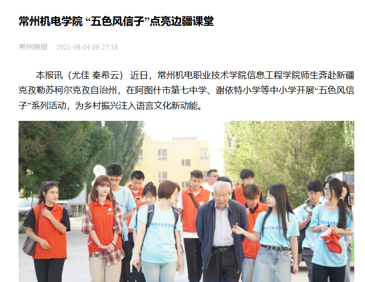 本报讯(尤佳 秦希云) 近日,常州机电职业技术学院信息工程学院师生奔赴新疆克孜勒苏柯尔克孜自治州,在阿图什市第七中学、谢依特小学等中小学开展“五色风信子”系列活动,为乡村振兴注入语言文化新动能。