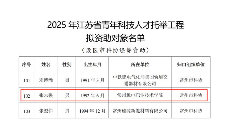 近日,2025年江苏省青年科技人才托举工程资助对象评选推荐结果公布。经各省级学会、省部属企事业单位、高校和设区市科协广泛发动,多渠道申报,专家评审,我校青年博士张志强成功入选。
