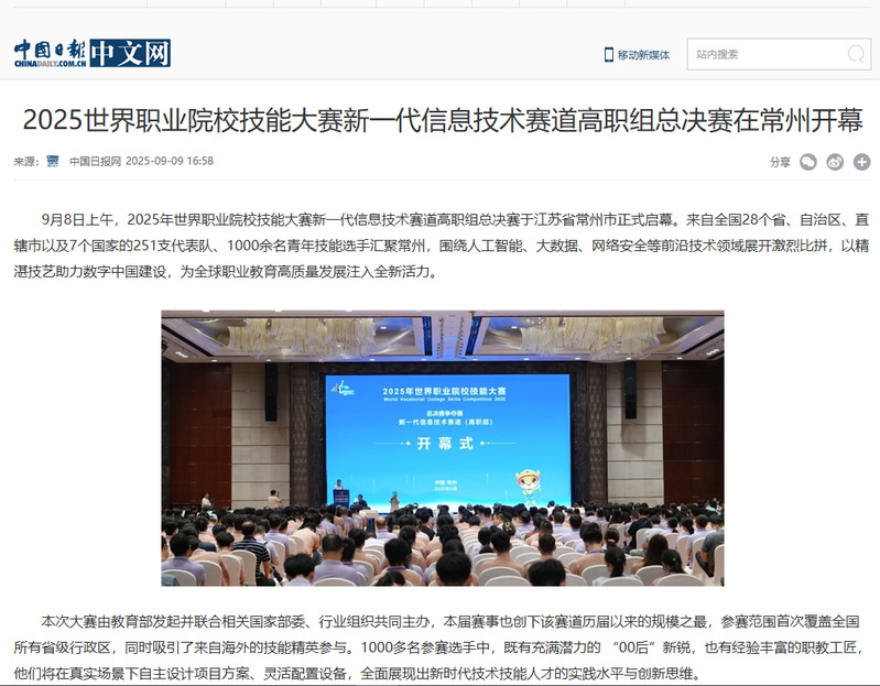 9月8日上午,2025年世界职业院校技能大赛新一代信息技术赛道高职组总决赛于江苏省常州市正式启幕。来自全国28个省、自治区、直辖市以及7个国家的251支代表队、1000余名青年技能选手汇聚常州,围绕人工智能、大数据、网络安全等前沿技术领域展开激烈比拼,以精湛技艺助力数字中国建设,为全球职业教育高质量发展注入全新活力。