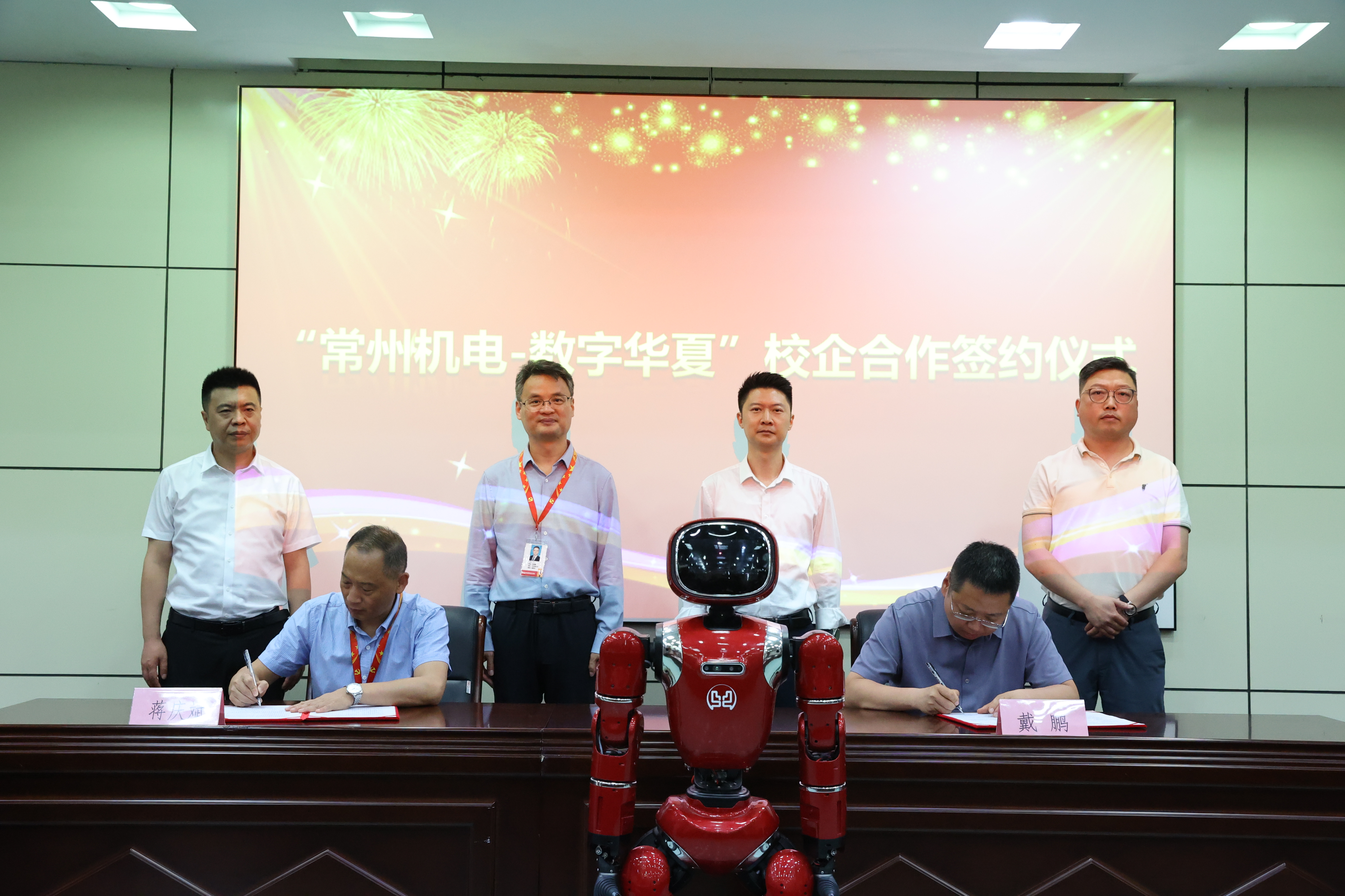2025年5月28日下午,常州机电职业技术学院与数字华夏共建的“具身智能机器人实践创新中心”揭牌暨创新班成立仪式在校内紫厅隆重举行。这标志着双方在深化产教融合、共育智能机器人领域高素质技术技能人才方面迈出了坚实一步。数字华夏创始人、CEO沈健,华夏机器人总经理戴鹏,江苏区总经理陈诚,常州区交付总监丁亚强,华夏机器人高级全栈工程师史永刚;常州机电职业技术学院党委委员、副校长刘贤锋,产教合作部部长刘刚,电气工程学院党总支书记周斌、院长蒋庆斌、副院长谢小敏、智能机器人专业负责人束攀峰等校企双方代表,智能机器人2431、机器人2438班全体学生共同出席了仪式。