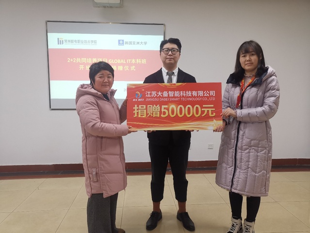 为进一步提高人才培养质量。12月2日下午,“信息工程学院、韩国亚洲大学2+2共同培养项目GLOBAL IT本科班开班暨企业捐赠仪式” 在信息楼会议室召开。国际合作与交流处处长高淑红、信息工程学院院长顾卫杰、韩国亚洲大学驻中国办事处主任陈星、江苏大备智能科技有限公司法人代表谢惠英、信息工程学院各教学团队主任及本科班学生出席了本次仪式。信息工程学院副院长楼竟主持了开班仪式。
