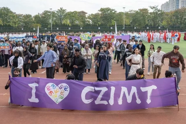 在开幕式上,留学生方阵呈现了充满活力的舞蹈表演《快乐崇拜》。他们身着民族服装、在中文歌曲的旋律中尽显青春活力。队伍中,“我爱中国”“I Love CZIMT”等中英文标语牌交替举起,生动传递着友好情谊。