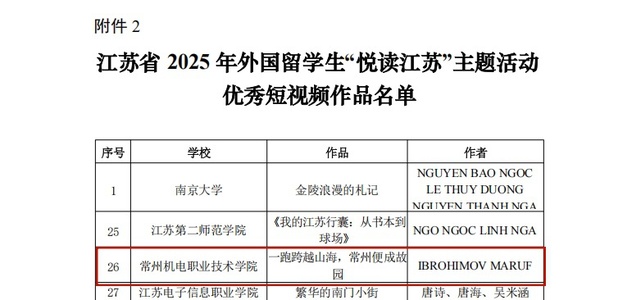 本次活动由江苏省教育厅指导、外国留学生教育管理研究委员会组织,共有52所高校推荐作品参赛。比赛中,我校将江苏地域文化作为育人载体,引导学生在“阅读+行走”中深度感知,并将理解升华为优秀的征文、摄影与短视频作品,实现了从文化输入到创新表达的闭环。近年来,我校立足常州“国际化智造名城”发展定位,深度融合专业特色,构建了独具特色的留学生培养体系:一是课程与实践并重,通过系统文化课程与常州博物馆、青果巷等实地教学,筑牢文化根基;二是竞赛与育人协同,常态化组织学生参与“悦读江苏”等品牌活动及各级专业竞赛,以赛促学,提升跨文化实践能力;三是产业与教学融合,依托汇川科技等本地智能制造龙头企业,开展企业参观与岗位实践,使留学生在真实生产环境中深化专业认知,切身感受中国智造发展成就。