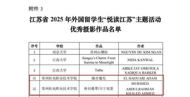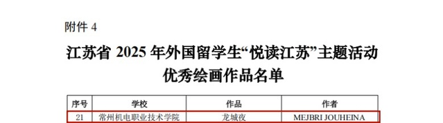 近日,2025年江苏省外国留学生“悦读江苏”主题活动评选结果公布。我校留学生创作的多项作品获奖,短视频作品《一跑跨越山海,常州便成故园》(作者:塔吉克斯坦 马洛夫)、摄影作品《城市潍光》(作者:摩洛哥 李锐)与《林径叠翠/天宁夜景》(作者:也门 孟家松)、绘画作品《龙城夜》(作者:突尼斯 梅佳兰)均被评为优秀作品。