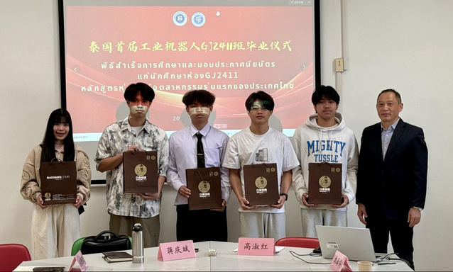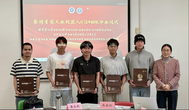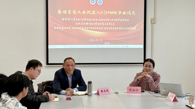 2026年1月13日,首届泰国留学生工业机器人 GJ2411 班结业仪式在国际教育学院顺利举行。电气工程学院院长蒋庆斌、国际教育学院院长高淑红及全体任课老师出席仪式,共同见证常州机电职业技术学院首届泰国工业机器人专业国际留学生圆满完成相关课程学习。此次结业仪式的举办,标志着学校在国际化教育发展进程中又迈出了坚实的重要一步。