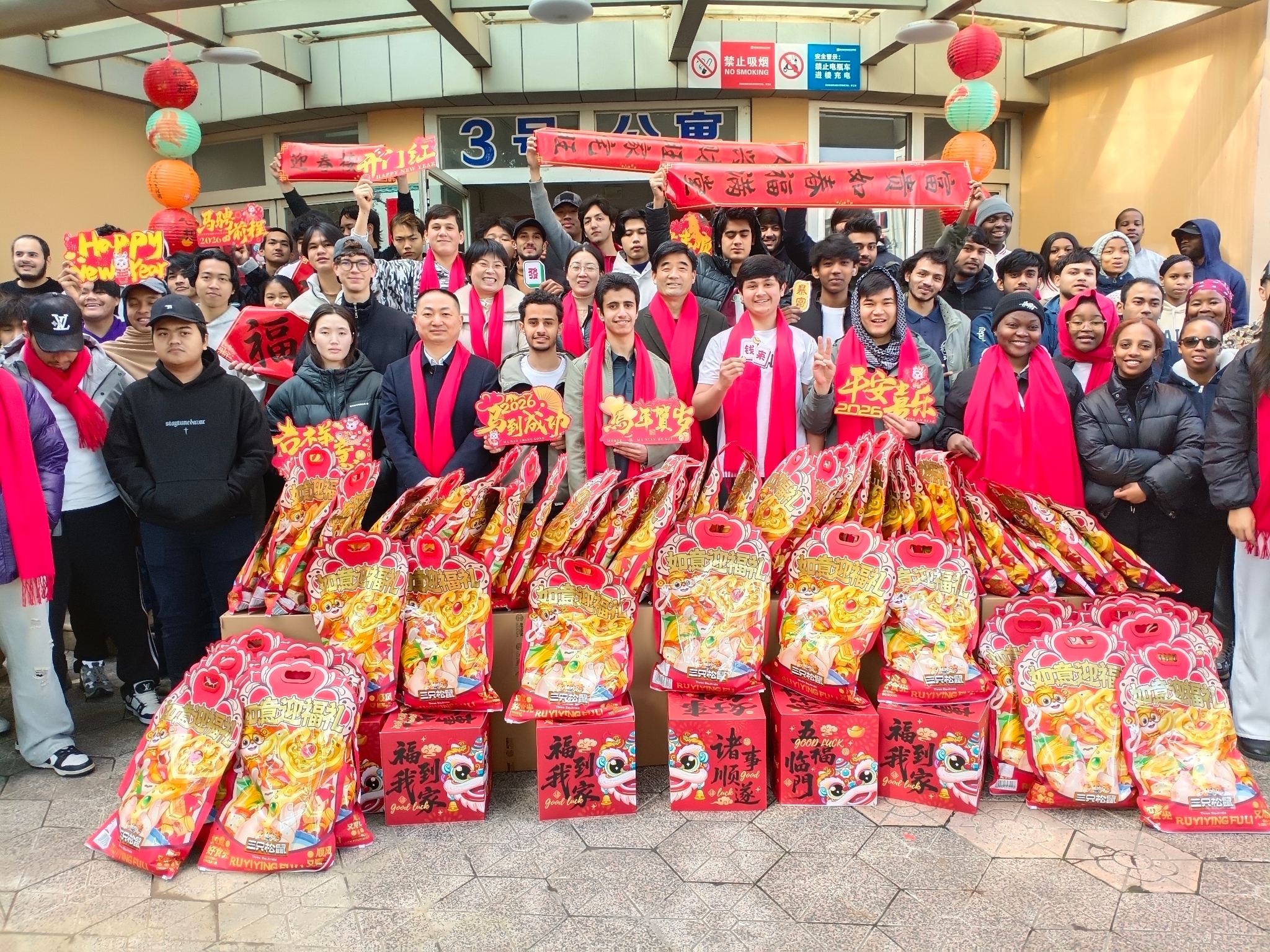 在武进校区3号公寓,许朝山专程看望了留校的百余名留学生,为他们送上中国马年的美好祝福。他详细询问同学们在校期间的学习生活情况,叮嘱大家注意安全、合理安排假期,度过一个平安、快乐、充实的中国年。许朝山勉励留学生们珍惜在中国的留学时光,在刻苦学习专业知识的同时,多了解中国文化,亲身感受中国的发展变化,争当中外友谊的使者和文化交流的桥梁。