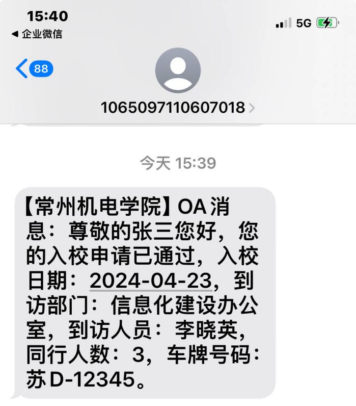 审批成功后,您会收到一条申请通过的通知,凭此短信即可进入学校。