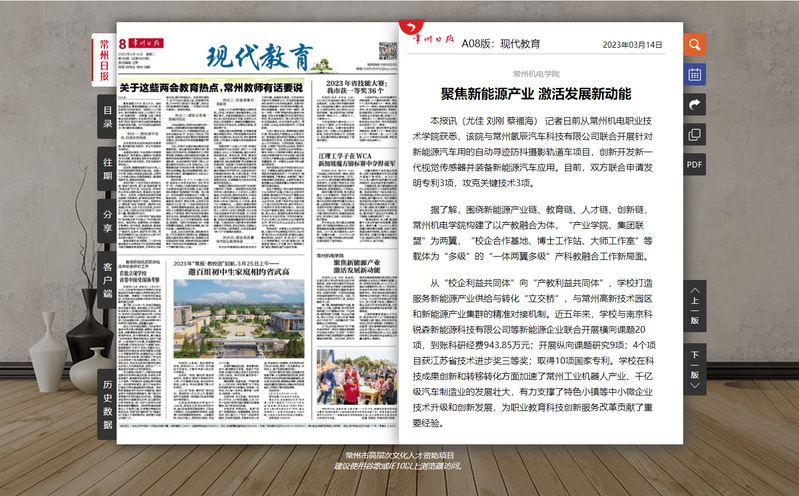 常州机电学院:聚焦新能源产业 激活发展新动能 发布时间:2023-03-15 作者: 访问次数:1690 本报讯(尤佳 刘刚 蔡福海)记者日前从常州机电职业技术学院获悉,该院与常州氢辰汽车科技有限公司联合开展针对新能源汽车用的自动寻迹防抖摄影轨道车项目,创新开发新一代视觉传感器并装备新能源汽车应用。目前,双方联合申请发明专利3项,攻克关键技术3项。 据了解,围绕新能源产业链、教育链、人才链、创新链,常州机电学院构建了以产教融合为体,“产业学院、集团联盟”为两翼,“校企合作基地、博士工作站、大师工作室”等载体为“多级”的“一体两翼多级”产科教融合工作新局面。 从“校企利益共同体”向“产教利益共同体”,学校打造服务新能源产业供给与转化“立交桥”,与常州高新技术园区和新能源产业集群的精准对接机制。近五年来,学校与南京科锐森新能源科技有限公司等新能源企业联合开展横向课题20项,到账科研经费943.85万元;开展纵向课题研究9项;4个项目获江苏省技术进步奖三等奖;取得10项国家专利。学校在科技成果创新和转移转化方面加速了常州工业机器人产业、千亿级汽车制造业的发展壮大,有力支撑了特色小镇等中小微企业技术升级和创新发展,为职业教育科技创新服务改革贡献了重要经验。 以培养高素质技能人才为目标,服务常州市“532”发展战略和“新能源之都”建设,学校近年来每年在江苏时代新能源、中航锂电、江苏星源、海目星等新能源领域知名企业实习就业人数400余人,2022年毕业生留常就业率33.15%,连续四年获江苏省高校毕业生就业工作量化督导A等高校。